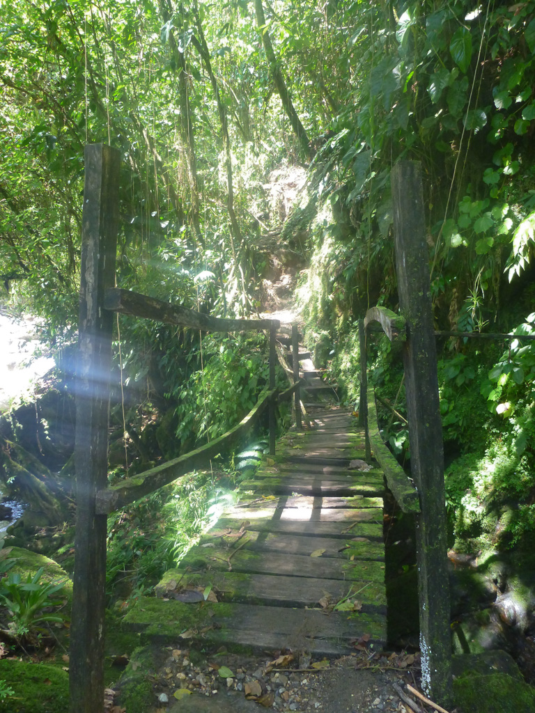 Le chemin est au milieu de la jungle, donc aucune vue de la cité perdue depuis un autre versant de montagne, et à cause des hélicoptères qui viennent deux fois par mois ravitailler les militaires chargés de la surveillance du site (avec des carabines d'1m50 et un collier de balles autour du torse, on ne rigole pas avec la sécurité), les animaux ont déserté les lieux (sauf les moustiques, bien évidemment). Seuls des colibris rouges et quelques grenouilles se montrent encore…